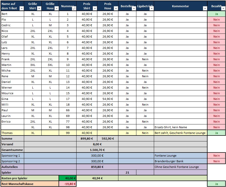So liebe Leute, die Shirts und Hosen sind jetzt bestellt. Lieferdatum ist etwa der 29. oder 30.10. Ich halte Euch darüber informiert. Ich hab‘ mit Steffi die Liste zweimal geprüft und keine Fehler gefunden, das müsste als so stimmen. Wenn Martin aus Versehen Größe XS bekommt, ist das Absicht. 🙂