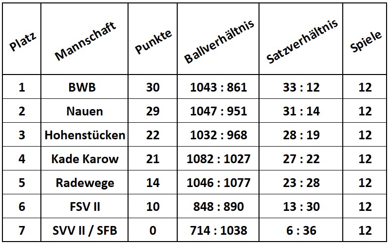 | 12.12.25 19.00 Uhr Willi-Sänger-Straße 77, 14770 Brandenburg | ![]() | BWB I | 22:25 25:17 18:25 25:18 8:15 2:3 |